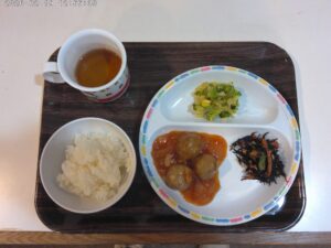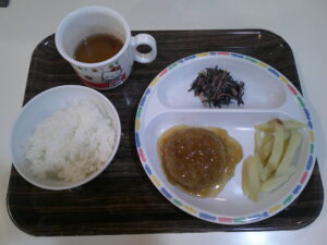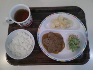 ご飯、豆腐ハンバーグ(照り焼きソース)ポテトのオーロラソース和え、キャベツのサラダ