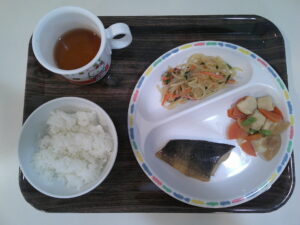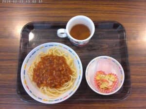 大豆ミートのスパゲティ、チーズ入りサラダ、マスカットゼリー