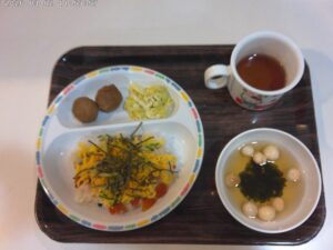 ひじきご飯、牛肉入りコロッケ、マカロニサラダ、味噌汁(大根、人参)