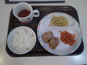 ご飯、鶏肉の生姜焼き、人参しりしり、キャベツのサラダ