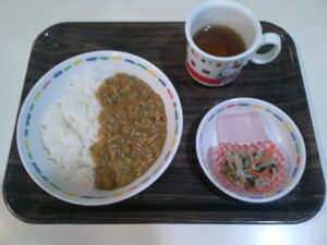 カレーライス、キャベツとコーンのサラダ、マスカットゼリー