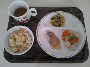 たけのこ入り炊き込みご飯、めばるの白味噌焼き、高野豆腐と野菜の煮物、ミネラルサラダ