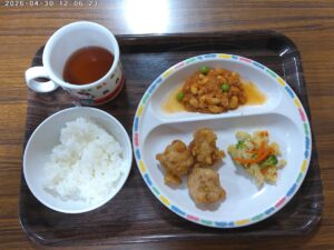 ご飯、鶏肉の唐揚げ、大豆のチリコンカン、彩りサラダ