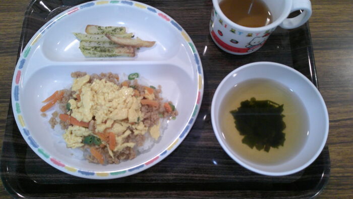 大豆ミートのそぼろ丼、青のりポテト、わかめスープ
