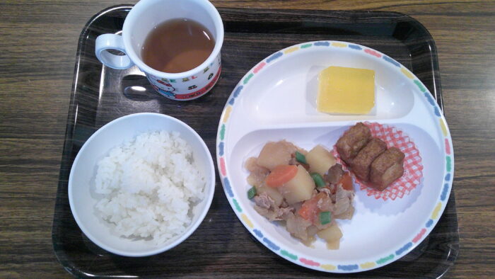 ご飯 肉じゃが 焼き厚揚げ オレンジゼリー