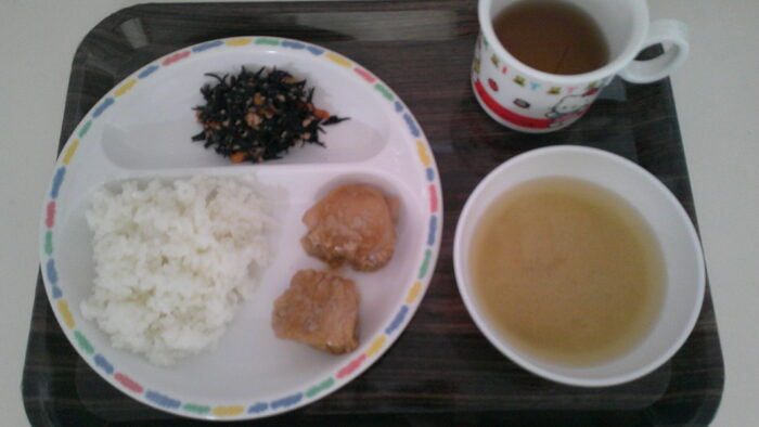 ご飯、鶏肉のねぎソース、ひじきの煮付け、味噌汁(玉ねぎ人参)