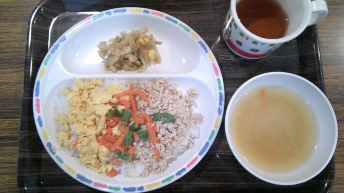 そぼろ丼、キャベツとコーンのサラダ、味噌汁(玉ねぎ、人参)