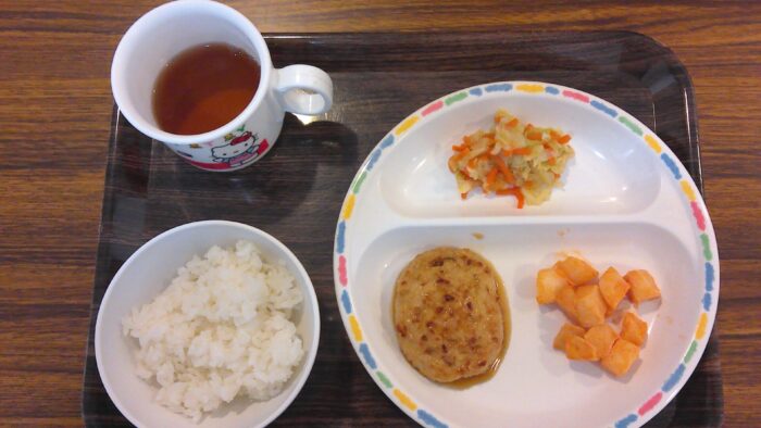 ご飯、豆腐ハンバーグ(照り焼きソース)ポテトのオーロラソース和え、キャベツのサラダ