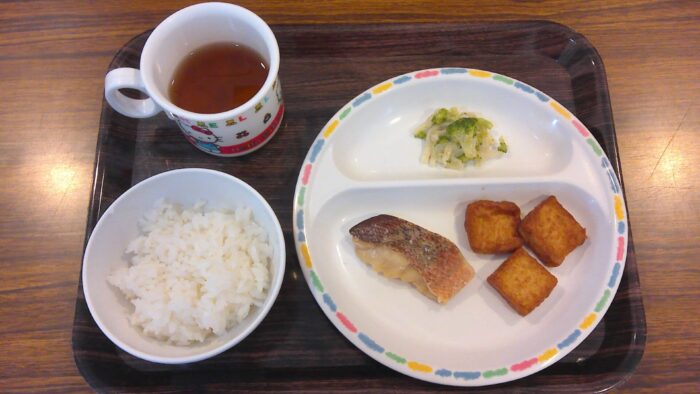 ご飯、めばるの白味噌焼き、焼き厚揚げ、野菜のごま風味サラダ