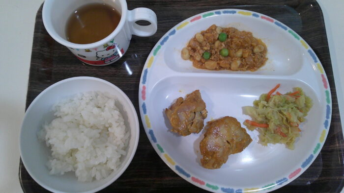 ご飯、タンドリーチキン、大豆のチリコンカン、キャベツのサラダ