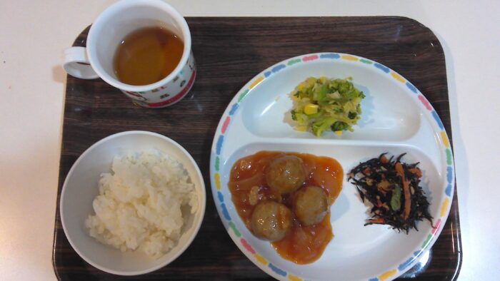 ご飯、肉団子の甘酢あんかけ、ひじきの煮付け、彩りサラダ
