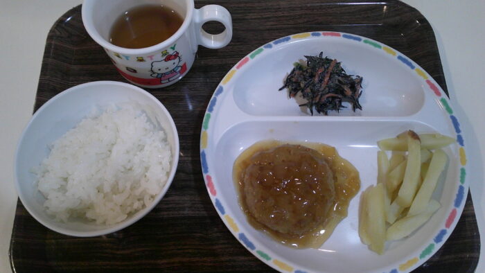 ご飯、ハンバーグ(オニオンソース)、フライドポテト、ひじきのミルキーサラダ