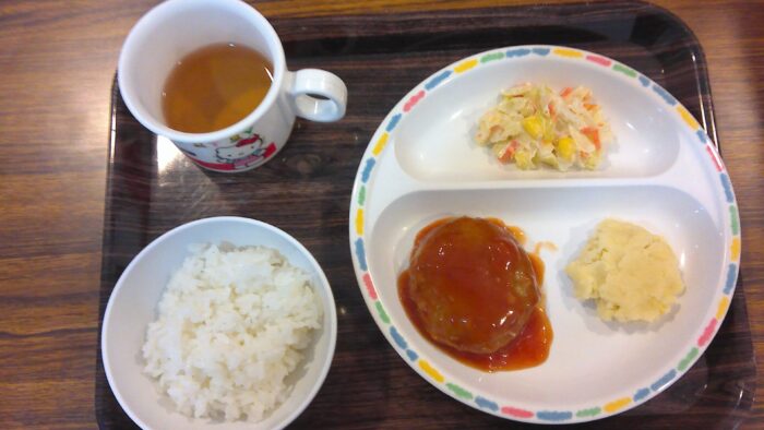 ご飯、ハンバーグ(ケチャップソース)マッシュポテト、キャベツとコーンのサラダ