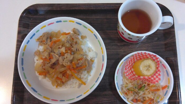 豚丼、もやしの信田和え(しのだあえ)、バナナ