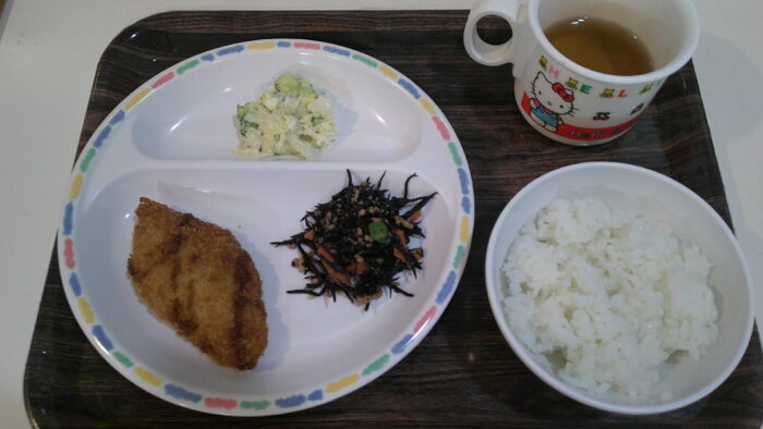 ご飯、白身魚フライ、ひじきの煮付け、チーズ入りサラダ