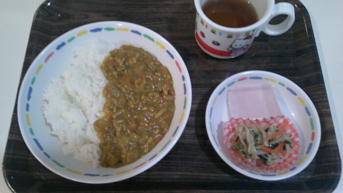 キーマカレー、もやしのサラダ、ピーチゼリー