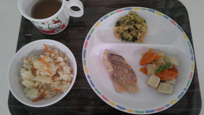 たけのこ入り炊き込みご飯、めばるの白味噌焼き、高野豆腐と野菜の煮物、ミネラルサラダ
