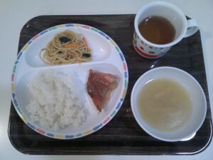 ご飯、赤魚の煮付け、和風スパゲティ、味噌汁(油揚げ、玉ねぎ)