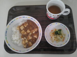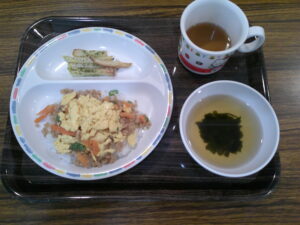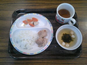 ご飯、鶏肉の白味噌焼き、高野豆腐と野菜の煮物、すまし汁(麩、わかめ)