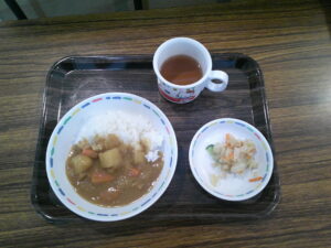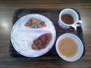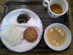 ご飯、ハンバーグ(ケチャップソース)ひじきの煮付け、味噌汁(麩、えのき)