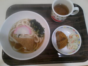 きつねうどん、メンチカツ、野菜のマヨ和え
