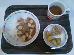 大豆ミートのそぼろ丼、青のりポテト、わかめスープ