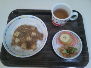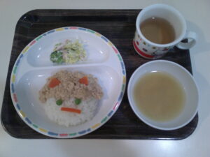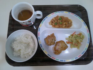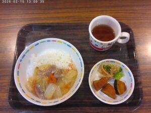 ♪ からだぽかぽかメニュー ♪ ご飯、鶏肉の生姜焼き、ビーフン、のっぺい汁