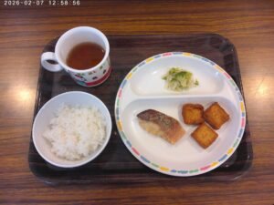 ご飯、めばるの白味噌焼き、焼き厚揚げ、野菜のごま風味サラダ