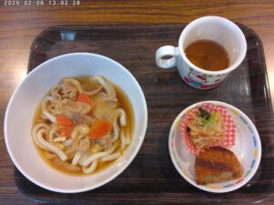 けんちん風うどん、牛肉入りコロッケ、もやしとほうれん草の和え物