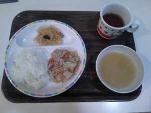 ご飯、焼肉風炒め、春雨サラダ、味噌汁(油揚げ・えのき)