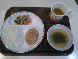 ご飯、豆腐ハンバーグ(照り焼きソース)もやしとほうれん草のサラダ、わかめスープ