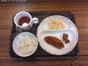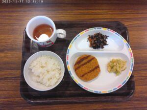 ご飯、メンチカツ、キャベツ添え、ひじきの煮付け