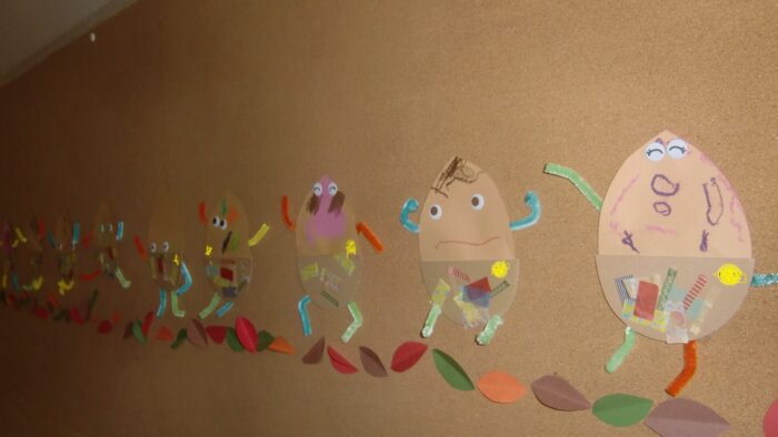 みんなの作ったドングリを並べて貼ったら、遠足しているみたいなりました。