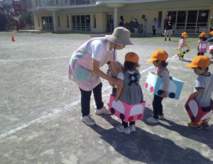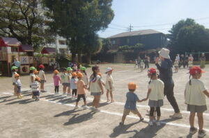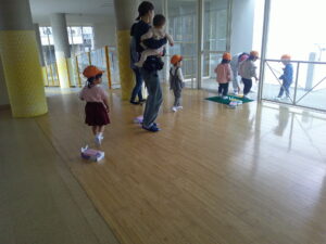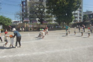 運動会ごっこでお姉さんと手をつないで走ったのが楽しかったので、ひよこ組も運動会ごっこをしました。