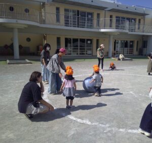 つぼみ組の箱電車を借りてよーいどん!楽しくて何度も何度も走った子もいました。年長組の大玉もみんなで抱きついたり、