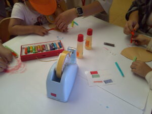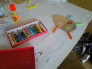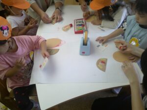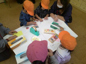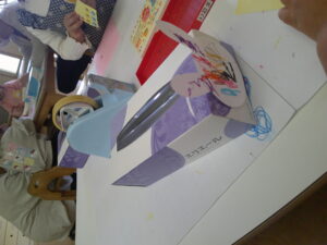 ティッシュの箱を使ってうさぎ作りをしました。クレパスで顔を描いたり、好きな色の折り紙にシールを貼って洋服にして