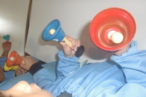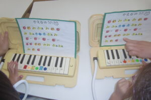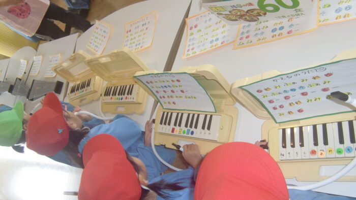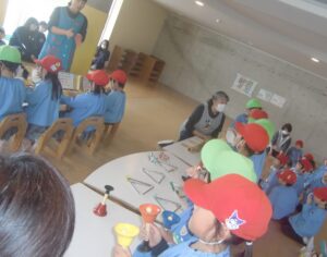 みんなで合わせることは難しかったようですが、音楽に親しみ音を出す楽しさや友だちとの一体感など味わうことができました。