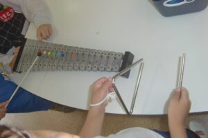 始めは鉄琴やメロディオンは個人練習をし、打楽器は楽器ごとに音を合わせられるように練習しました。