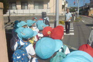 園長先生のお話の後、年長組と年少中組がペアになり手をつないで出発! 年長組は自分が車道側を歩くようにしたり
