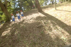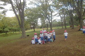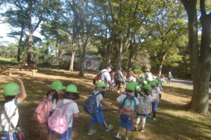 つぼみ、年少中組は園バスで、年長組は歩きます!水飲み休憩の時にどんぐりを拾ったり歌ったり世間話をしながら