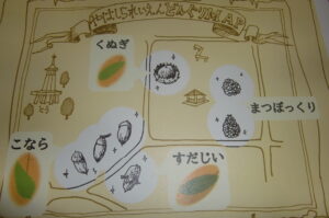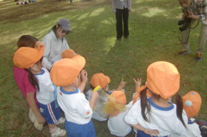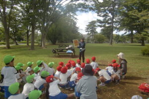 年長組は八柱霊園の係の方から、どんぐりの木がある場所や落ちている葉っぱの事など教えてもらいました。