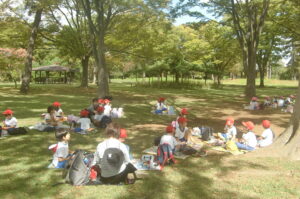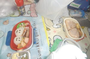 お弁当はだいたいクラスごとにまとまって食べました。おにぎりのお弁当が多かったかな‥‥おやつも嬉しかったね。