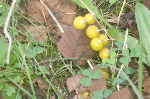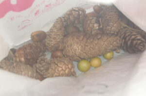 黄色い実はワルナスビ(?)、赤い実、松ぼっくりも拾いました。