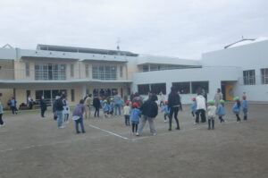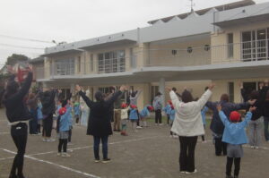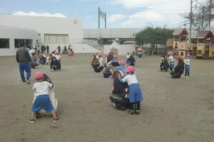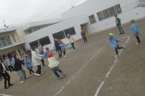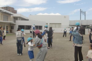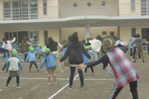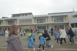 お父さんお母さんと一緒にデイズニー体操をして、身体をほぐしてから、ドッチボール大会をしました。