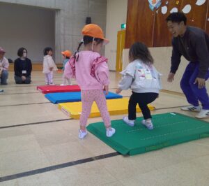 楽しくなってきたら、自然とお母さんから離れて、ジャンプや跳び箱のお山登りなど、先生の話をよく聞いて動けるようになりました。