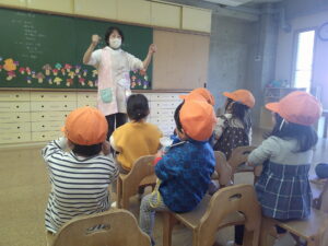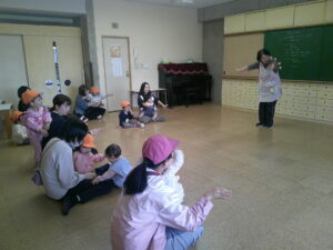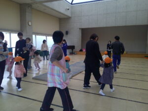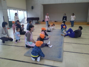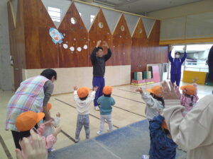 10月31日 体操の林先生と一緒に体操ごっこをしました。前に立つ先生をよく見て、手をぐるぐる回したり、マットの周りを走ったり…。