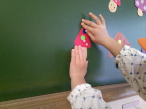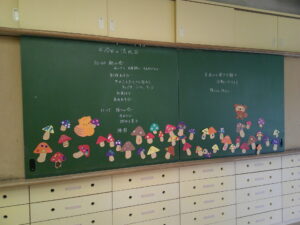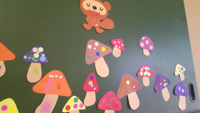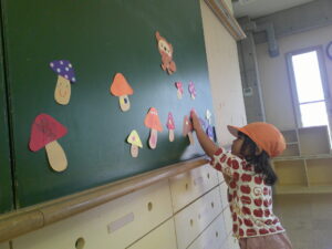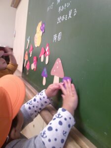 出来たきのこは黒板の好きなところに貼っていきました。背伸びをしたり、どこに貼ろうか迷ったりする姿もありました。