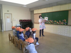 帰りに、みんなの作った作品の前で、きのこや秋の果物が出てくる絵本を見て帰りました。