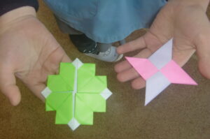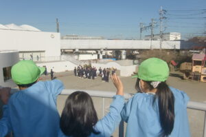 不二幼稚園の卒園児も多くいて、園庭や園舎を懐かしんだり、先生との会話も盛り上がっていました。宝探しの景品はかわいい折り紙。「また来てね!」帰りはテラスからみんなで手を振りました。