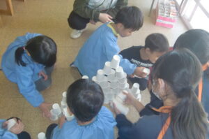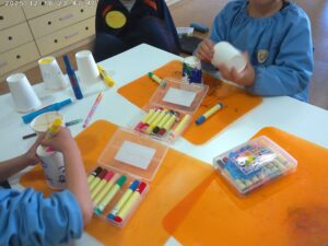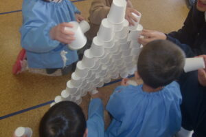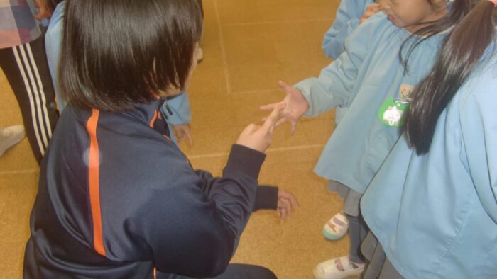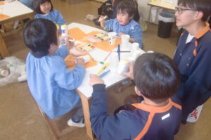 年長組はジャンケン列車や爆弾ゲーム、宝探しゲームなどを考えてきてくれて一緒に遊びました。年中組は紙コップを使った遊びを教えてもらいました。